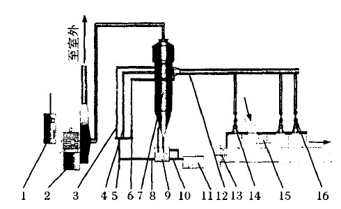 1、程控柜2、專用風(fēng)機(jī)3、內(nèi)筒進(jìn)水閥4、外筒進(jìn) 水閥5、給水閥(電動(dòng)或手動(dòng))6、備用旁路閥7、DSX型濕式除塵器8、排污沖洗閥9、自溢式水箱10、排污閥11、粉煤灰池12、吸塵管路13、輸煤皮帶14、吸塵罩15、雙層導(dǎo)料槽16、風(fēng)量調(diào)節(jié)閥